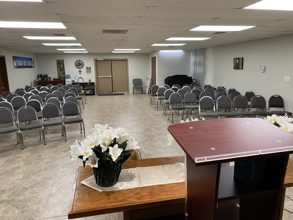 Last year, we remodeled main Worship Center.  We are now in the process of upgrading our Spanish Worship Center  At our next business meeting (on Wednesday night, April 29, at 6:30 pm), we will vote to purchase chairs like those in the English Worship Center.  (See the picture from their pulpit.  They are currently using old Sunday School chairs.)