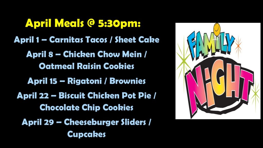 5:30 Meal & Prayer6:30 Classes & Choirs